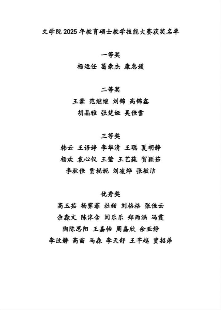 经过多轮严格评审,最终评选出获奖名单。“教而不研则浅,研而不教则空。”本次教育硕士教学技能大赛,既是对同学们学习成果的检验,更是一次集中的教学实践练兵。未来,文学院将持续搭建此类实践平台,助力“准教师”们在打磨技能、反思成长中,早日成长为适应新时代基础教育需求的优秀语文教师。