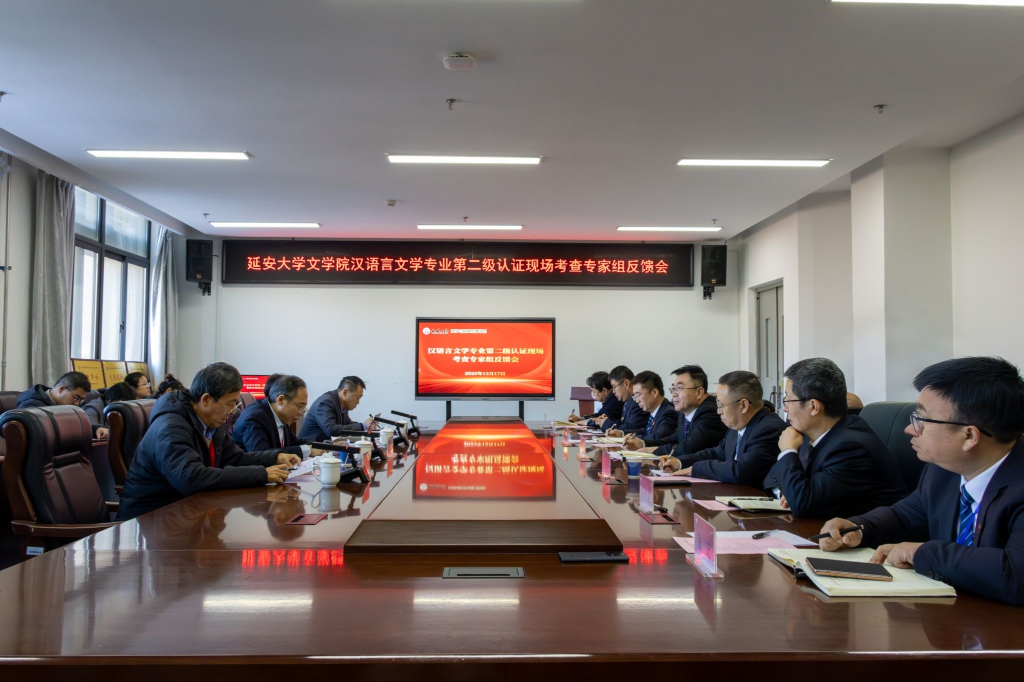 12月15日上午,专家组现场考查见面会在学院408会议室举行。会上,院长党子奇教授代表学院从学院简介、专业发展、特色做法、育人成效及问题与改进五个维度作了详细汇报。他说,作为扎根红色革命老区的师范专业,学院在汉语言文学专业建设过程中立足延安独特的红色沃土,创新构建“红色铸魂、黄土培根、课程筑基、实践赋能”四维融合的中学语文教师培养新模式。