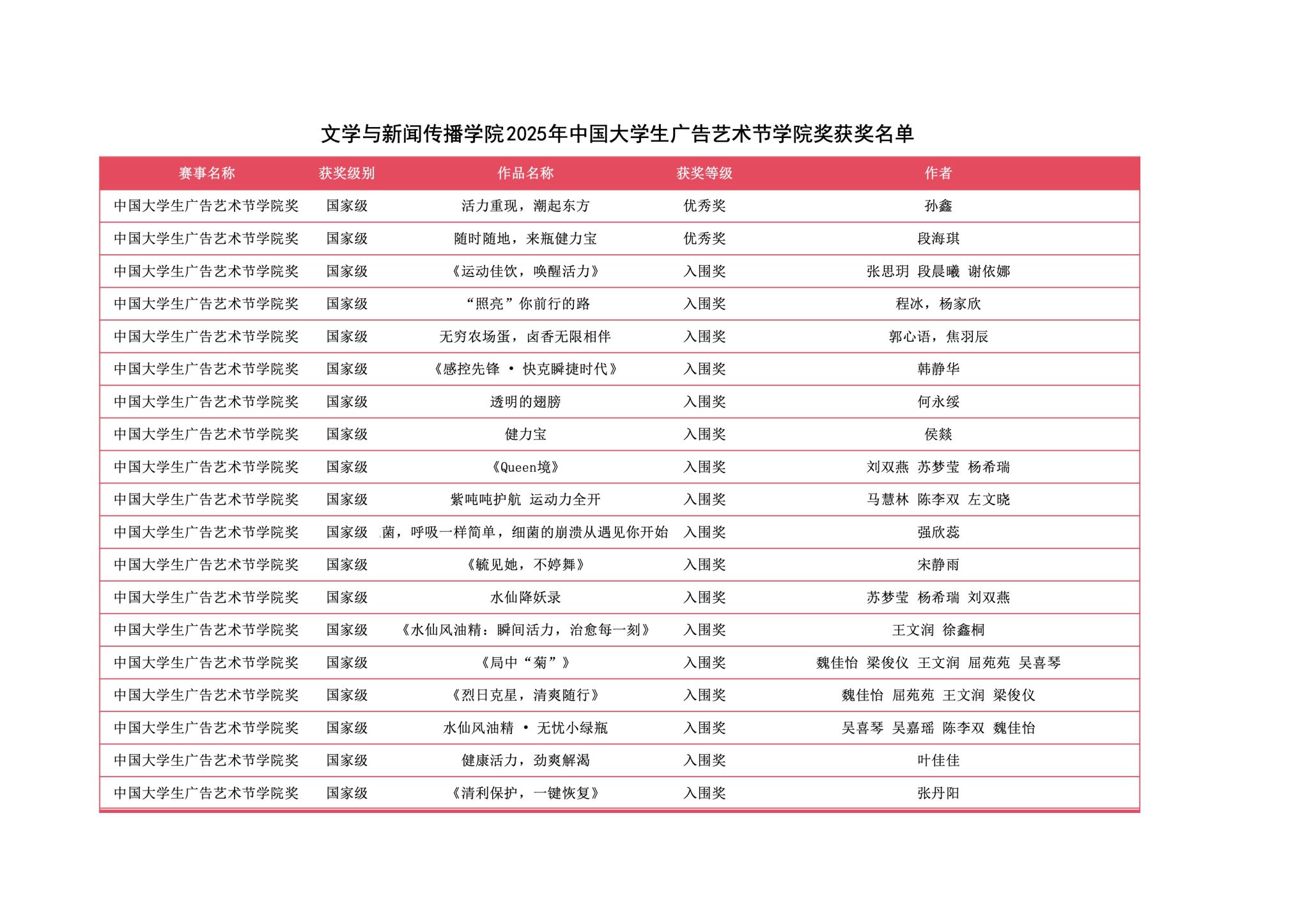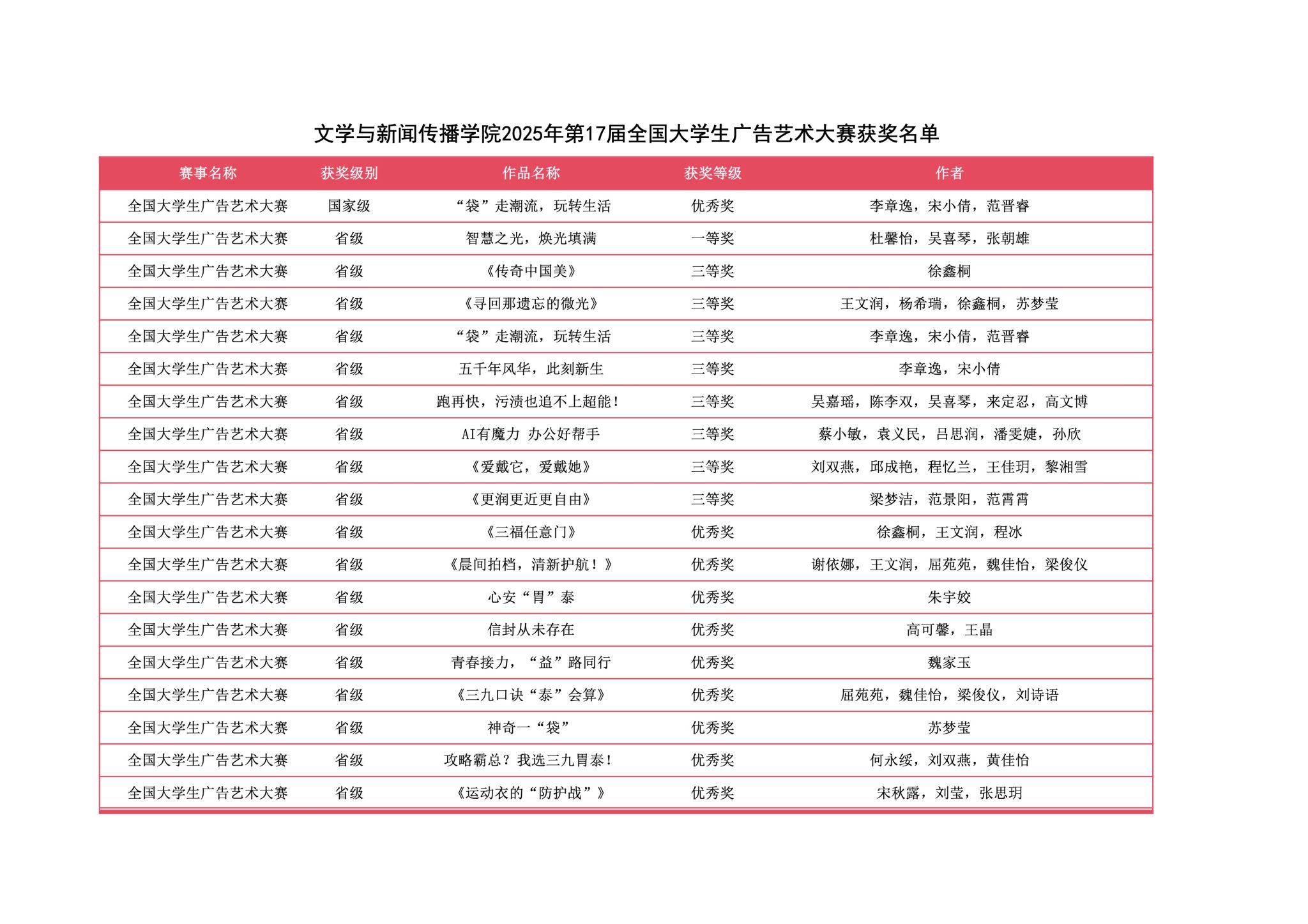 此前,在2025年中国大学生广告艺术节学院奖竞赛中,文学院学子已崭露锋芒,斩获国家级优秀奖2项、入围奖18项。作为全国性B类学科竞赛,学院奖以“实战、实效、实学”为特色,深化高校与企业真实需求对接,聚焦“青春创意”与“品牌实效”的融合,其权威性与影响力广受业界、学界认可。