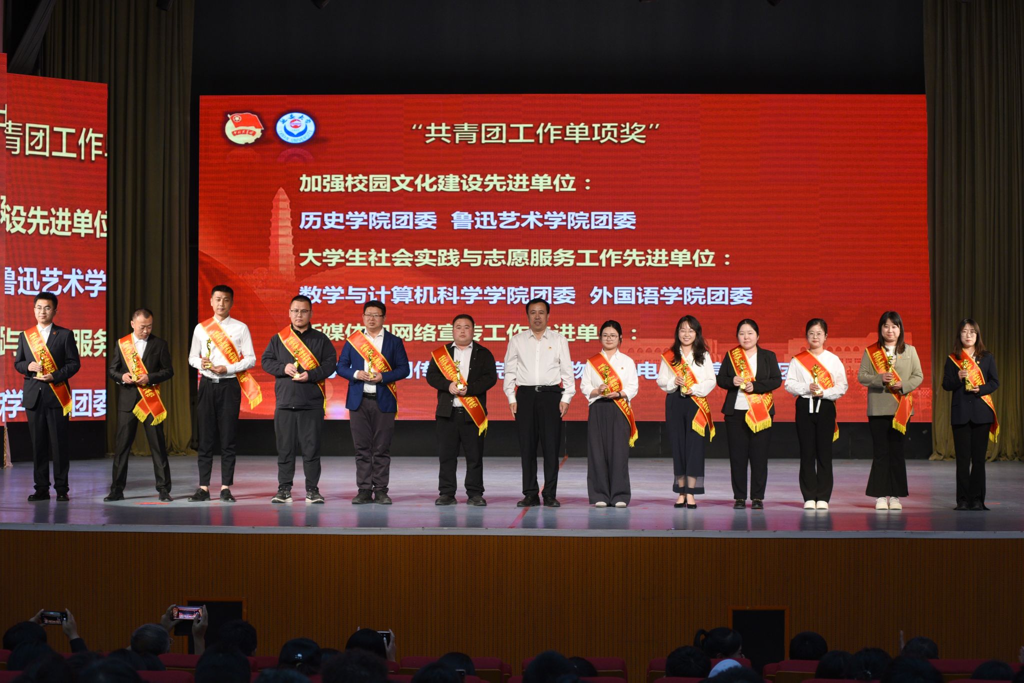 与会领导嘉宾为荣获“五四红旗团委”“支持共青团工作好书记”“优秀专兼职团干”“五四红旗团支部”“最佳团日活动”荣誉称号的集体和个人颁奖;各学院党委副书记为荣获“十佳团支书”“十佳学习标兵”等6类“十佳”荣誉称号的先进个人颁奖。
