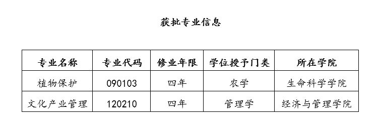 本网讯 近日,教育部发布了《教育部关于公布2024年度普通高等学校本科专业备案和审批结果及〈普通高等学校本科专业目录(2025年)〉的通知》(教高函〔2025〕3号),我校申报的植物保护、文化产业管理两个专业获批增设为普通高等学校本科专业。