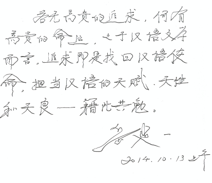 “写作之夜丛书”常务副主任、北大荒知青岳建一的题词