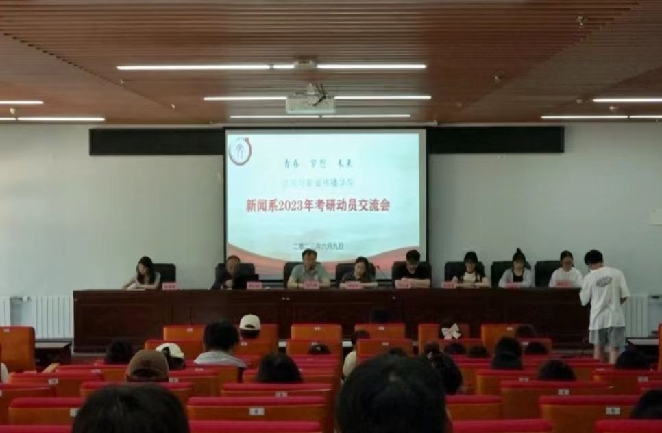 (本网讯) 6月9日下午,学院新闻系在201报告厅举办考研经验交流会。新闻系教授、院党委书记党子奇,新闻系郭小良、任勇胜,19级考研学生李缠缠、郝晶晶、邵佳豪、陈雨薇、于雅婷、樊可心和新闻系全体同学参加活动。活动由郭小良主持。