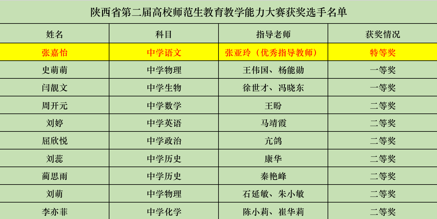 (本网讯)6月2日,陕西省教育厅公布了陕西省第二届高校师范生教育教学能力大赛获奖名单,我校语文、物理、生物、数学、英语、政治、历史、化学共8个学科10名选手分别荣获特等奖1项,一等奖2项,二等奖7项。其中我院张嘉怡获得陕西省第二届高校师范生教育教学能力大赛中学语文组特等奖,我院张亚玲博士荣获中学语文组优秀指导教师。