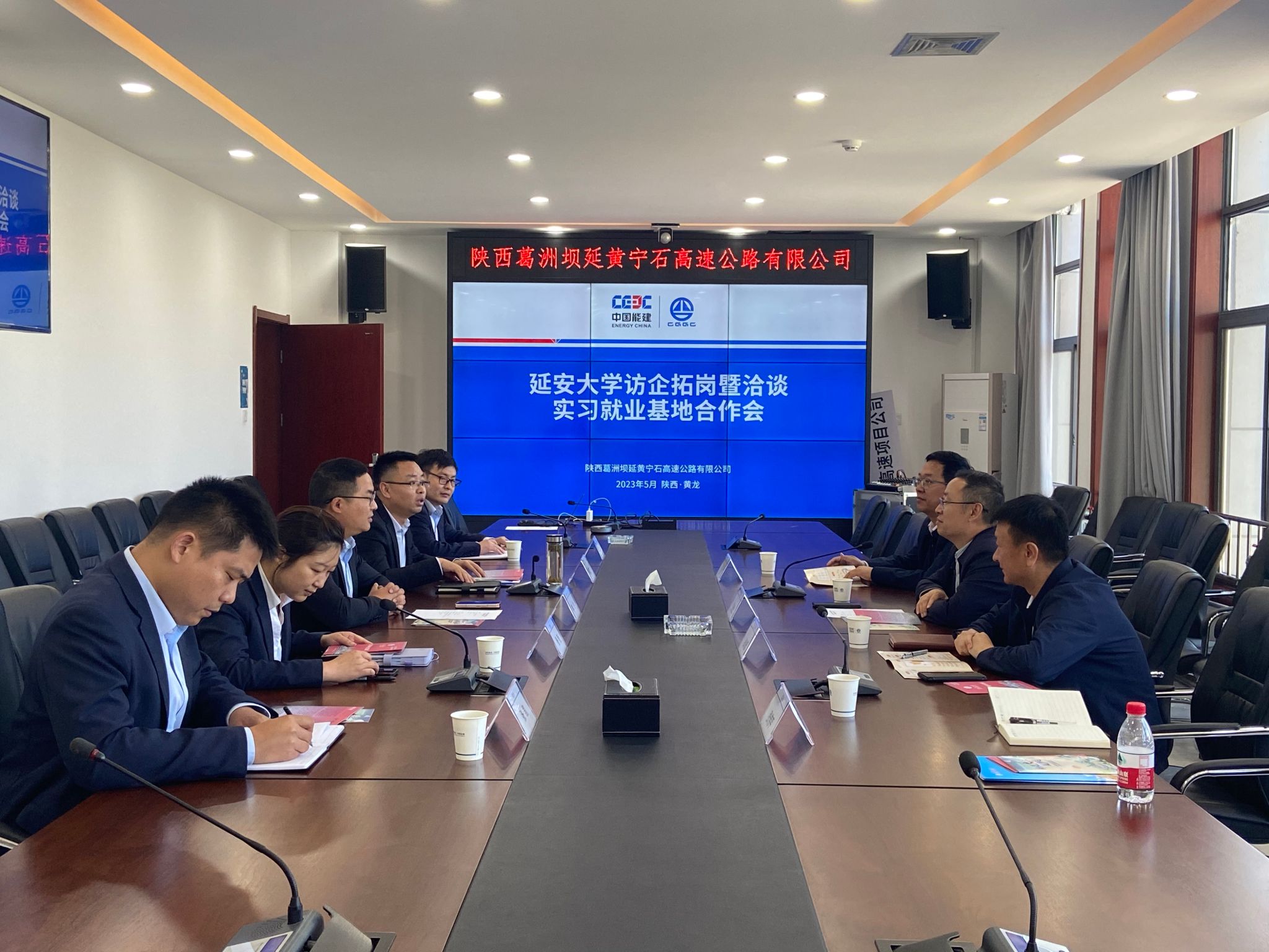 (本网讯)为贯彻落实全国全省2023届普通高校毕业生就业创业工作会议精神,深入推进访企拓岗促就业专项行动,对接企业用人需求,拓宽毕业生就业渠道和资源,全力促进毕业生更加充分更高质量就业,5月22日,文学与新闻传播学院院长王俊虎、党委副书记张冰雁、副院长刘鑫、组织员张伟平一行4人赴陕西葛洲坝延黄宁石高速公路有限公司开展访企拓岗,并洽谈实习就业基地合作。陕西葛洲坝延黄宁石高速公路有限公司党支部书记、董事长总经理李发,副总经理吴昌江,综合管理部(党群工作部)主任张竞,工程管理部主任张凯等参加了会议。