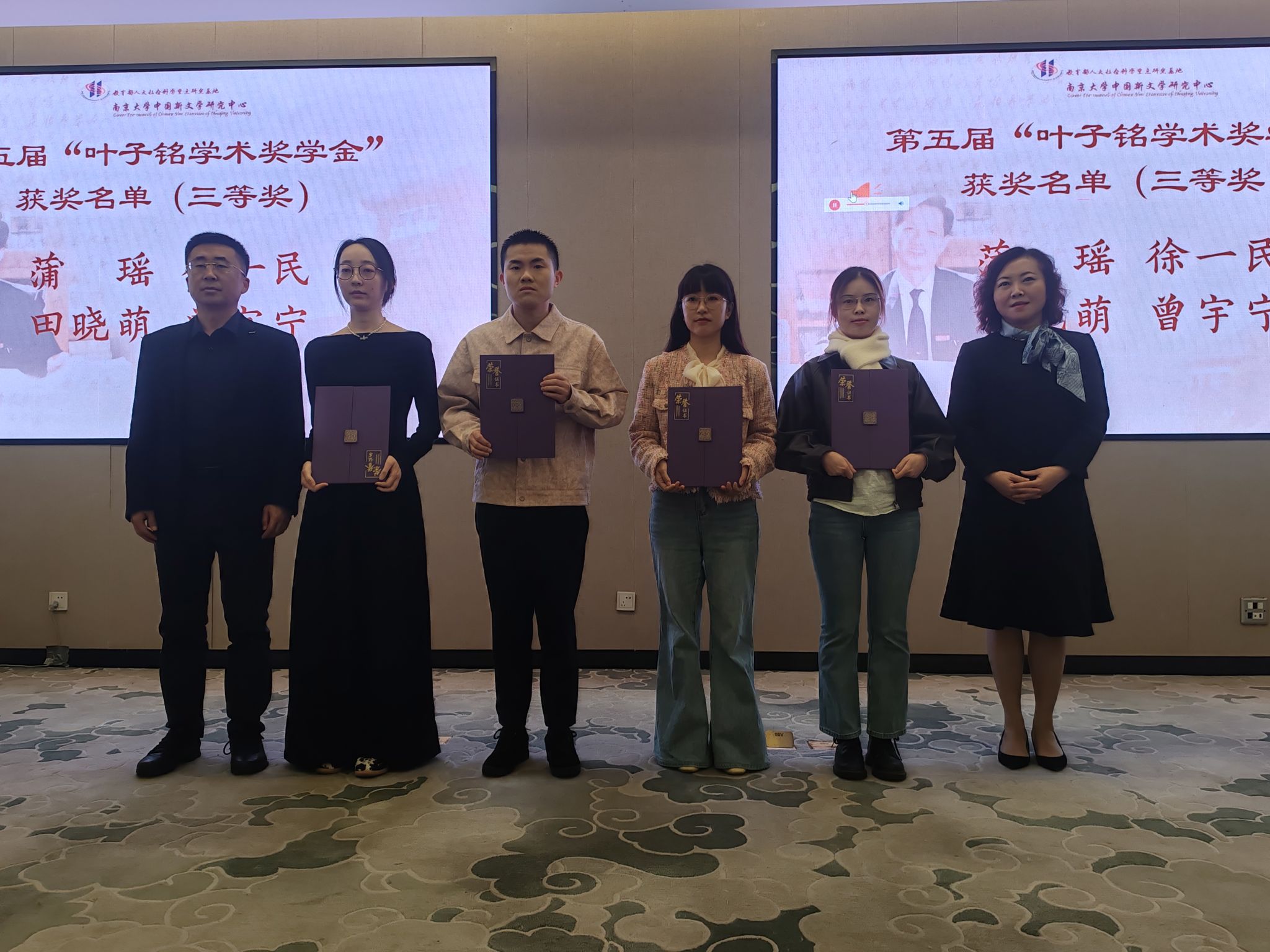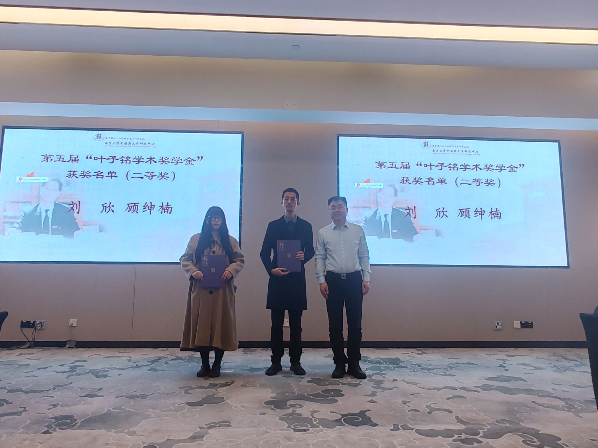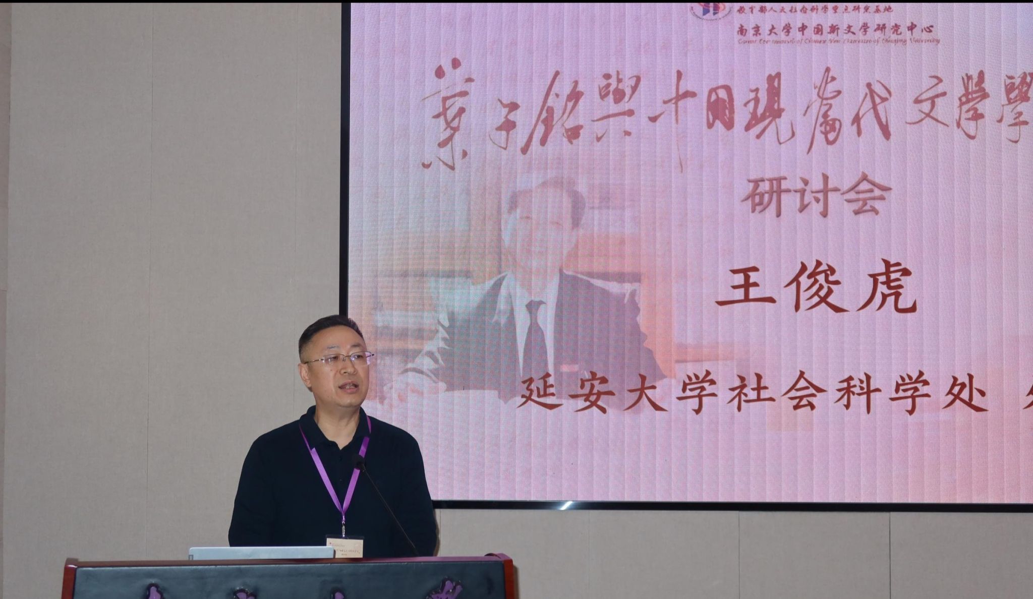 延安大学社科处处长、文学院教授王俊虎在研讨会主题论坛上做了《延伸学科触角,示范与引导全国中文学科发展》的大会发言。王俊虎处长认为,南京大学中国新文学研究中心与延安大学文学院共建解放区文学研究所(延安大学基地)是一项创新性的战略举措,必将带动我校延安文艺研究中心、红色文艺研究中心的建设与发展,甚至对推动全国解放区文学研究具有深远意义。叶子铭先生作为现代文学史研究领域的泰斗,其严谨的治学态度与开阔的学术视野,为中国现当代文学学科发展奠定重要基础,更对解放区文学研究具有深刻启示意义。两校联合不仅是对叶子铭先生学术遗产的传承致敬,更是整合科研力量、深化红色学术研究的重要实践。党子奇院长、姬小龙书记作为颁奖嘉宾分别为第五届“叶子铭学术奖学金”获奖学生颁奖。