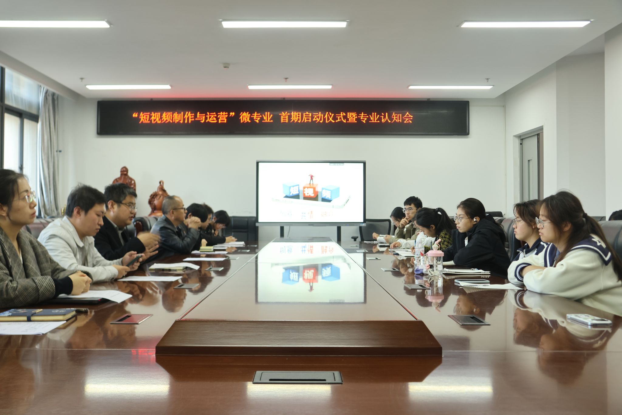 (本网讯)11月3日下午,学院召开“短视频制作与运营”微专业首期启动仪式暨专业认知会,同时开展新闻系教研室活动。学院院长党子奇、副院长侯业智、教学秘书沈江涛、教务员李领弟,微专业任课老师郭小良、张晟、李鹏睿、姚丹、李星瑶、彭迪和首批微专业30名学生参加了启动仪式。启动仪式由侯业智副院长主持。
