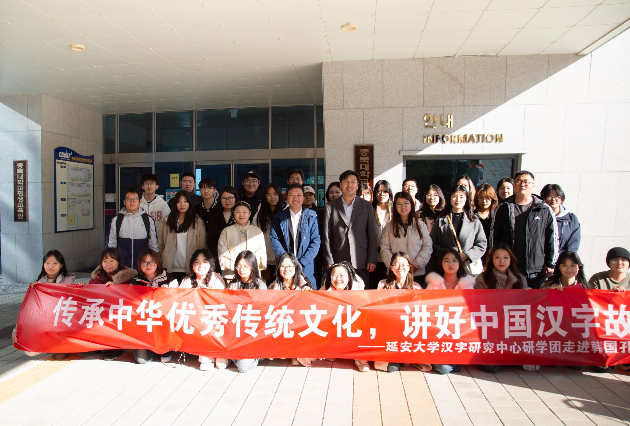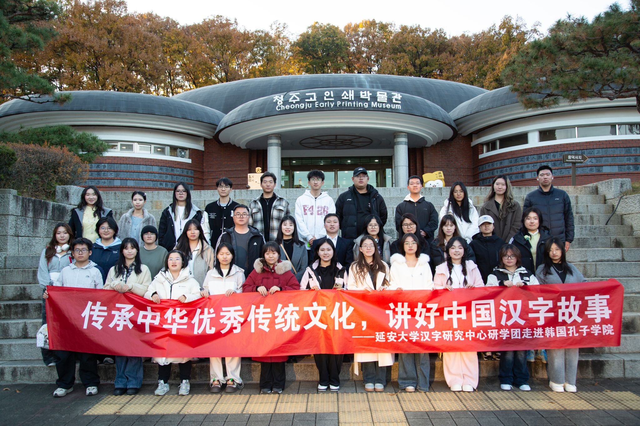 (本网讯)近日,习近平主席复信应邀参加2025世界中文大会的青年汉学家时强调,汉学源自中国、属于世界,是全人类共同的精神财富。希望他们继续与汉学结伴、和中国同行,加强研究阐释,向世界介绍真实、立体、全面的中国,当好融通中外文明的使者,为推动构建人类命运共同体贡献智慧和力量。为响应这一倡议,推动中华优秀传统文化国际传播,深化汉字文化学术交流,延安大学文学院组织李鹏睿、温鹏升等三十余名师生于11月19日赴韩开展为期五天的汉字文化交流研学活动,围绕汉字研究与中华优秀传统文化的传播,与韩方专家学者进行了深入、友好的互动与研讨,成功搭建了中韩人文交流的新桥梁。此次交流不仅是高校间的人文互动,更是对接国家“文化出海”战略、深化中外文明互鉴的生动实践。通过汉字研究与文化传播的深度融合,研学团以汉字为媒介,向国际社会展现了中华文化的独特魅力,为新时代中华优秀传统文化的国际传播提供了创新范式。
