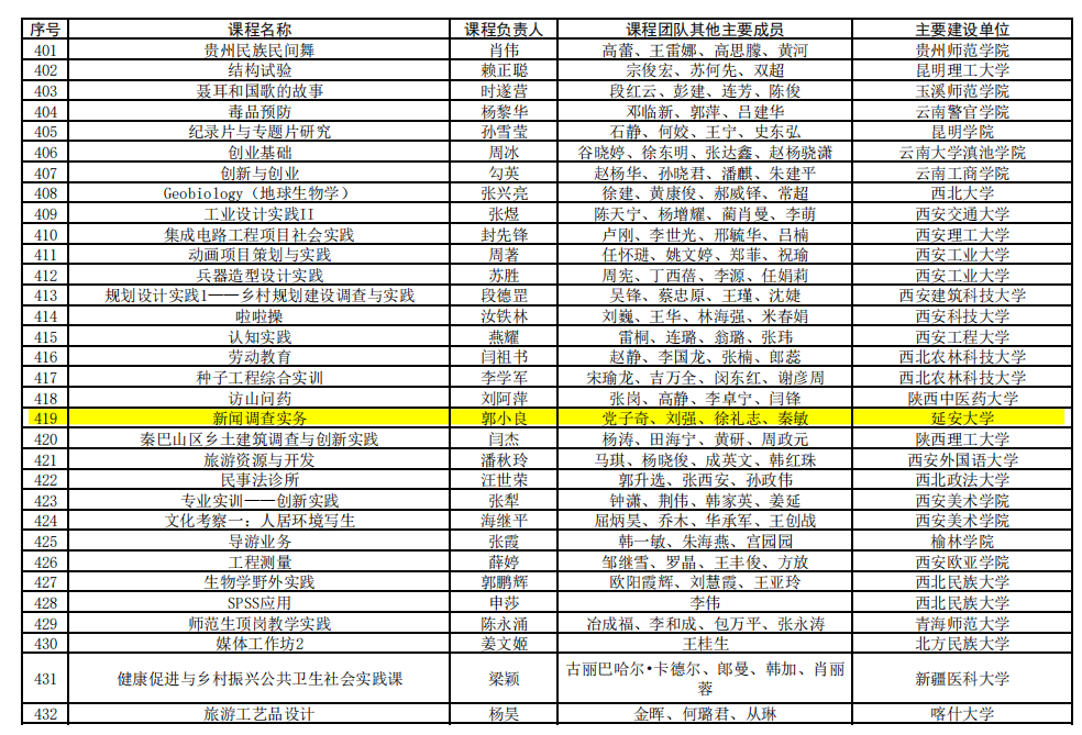 (本网讯)根据教育部近日下发的《教育部关于公布第三批国家级一流本科课程认定结果的通知》(教高函〔2025〕9号),学院郭小良教授负责,党子奇教授、刘强副教授、徐礼志副教授、秦敏副教授等参与的《新闻调查实务》课程被认定为第三批国家一流课程(社会实践类),该课程2019年被认定为省级一流课程。这是学院继《红色经典导论》《陕甘宁边区新闻史》之后获批的第三门国家级课程。
