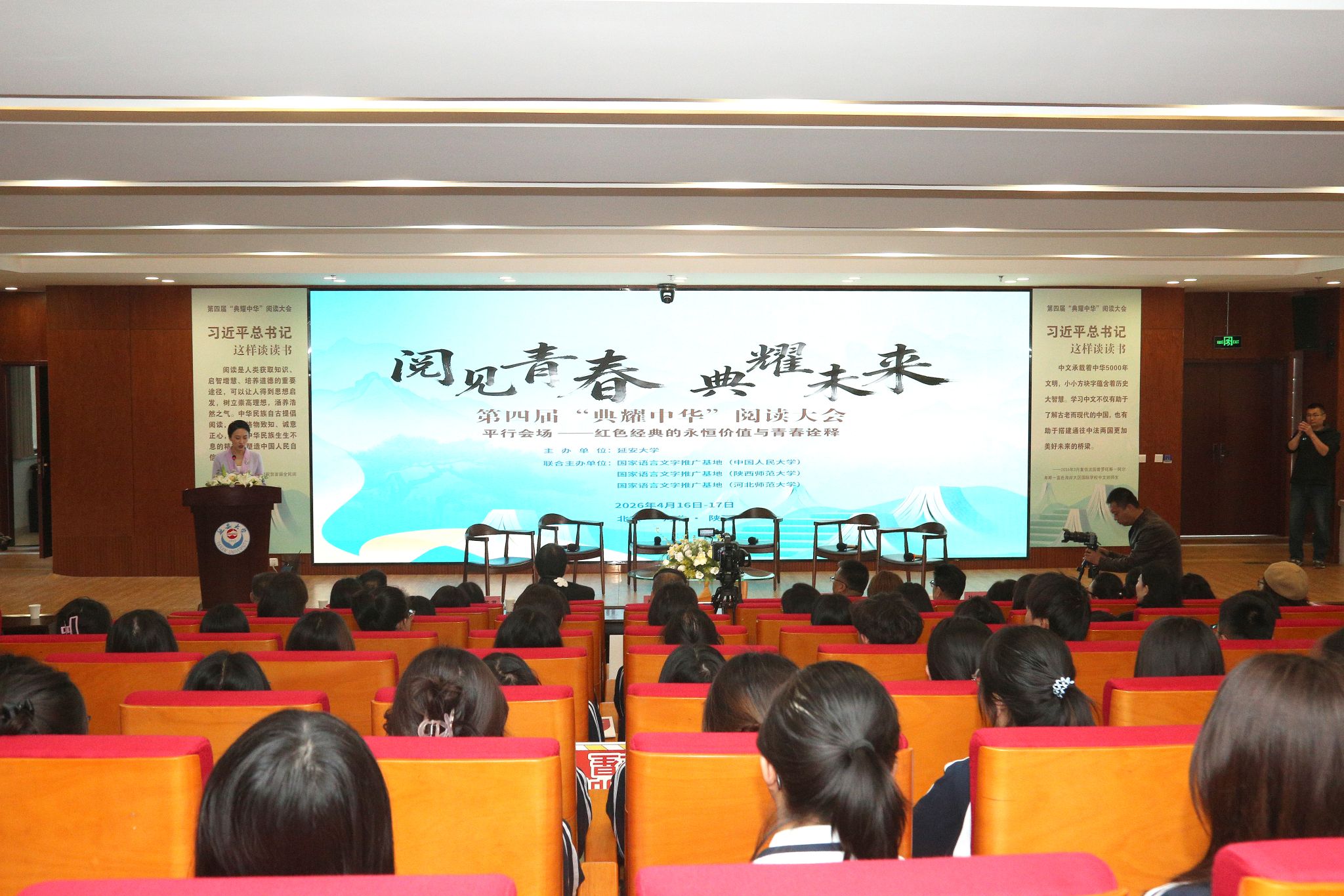(本网讯) 为深入学习贯彻习近平文化思想,深入实施《教育强国建设规划纲要(2024—2035年)》,贯彻落实国家通用语言文字法和《全民阅读促进条例》,深化“典耀中华”主题读书行动,4月16日至17日,国家语言文字推广基地(中国人民大学、河北师范大学、陕西师范大学)和延安大学共同主办了第四届“典耀中华”阅读大会。