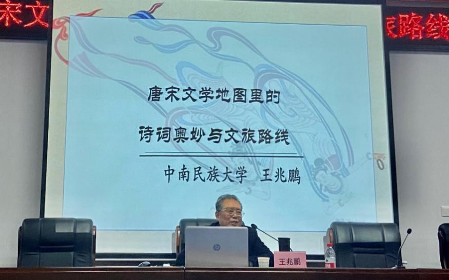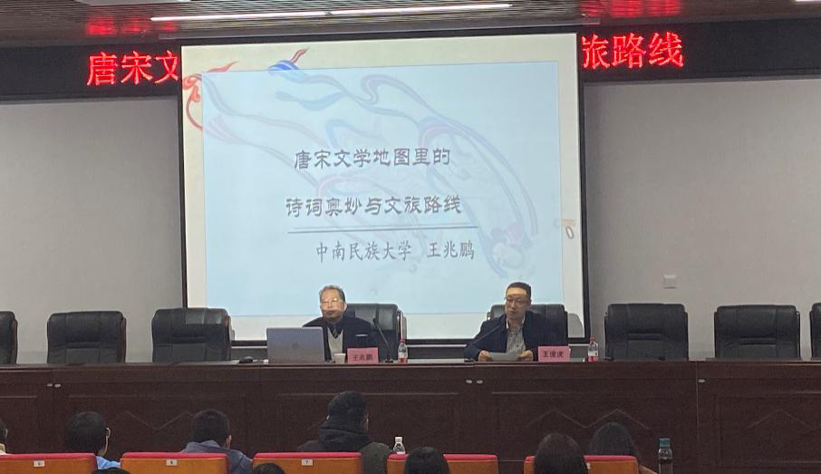 (本网讯)10月11日晚,应文学院邀请,中南民族大学王兆鹏教授在文学楼201学术报告厅作了题为《唐宋文学地图里的诗词奥妙与文旅路线》的学术报告。本次报告由文学院院长王俊虎教授主持,文学院部分师生约200人聆听了此次报告。