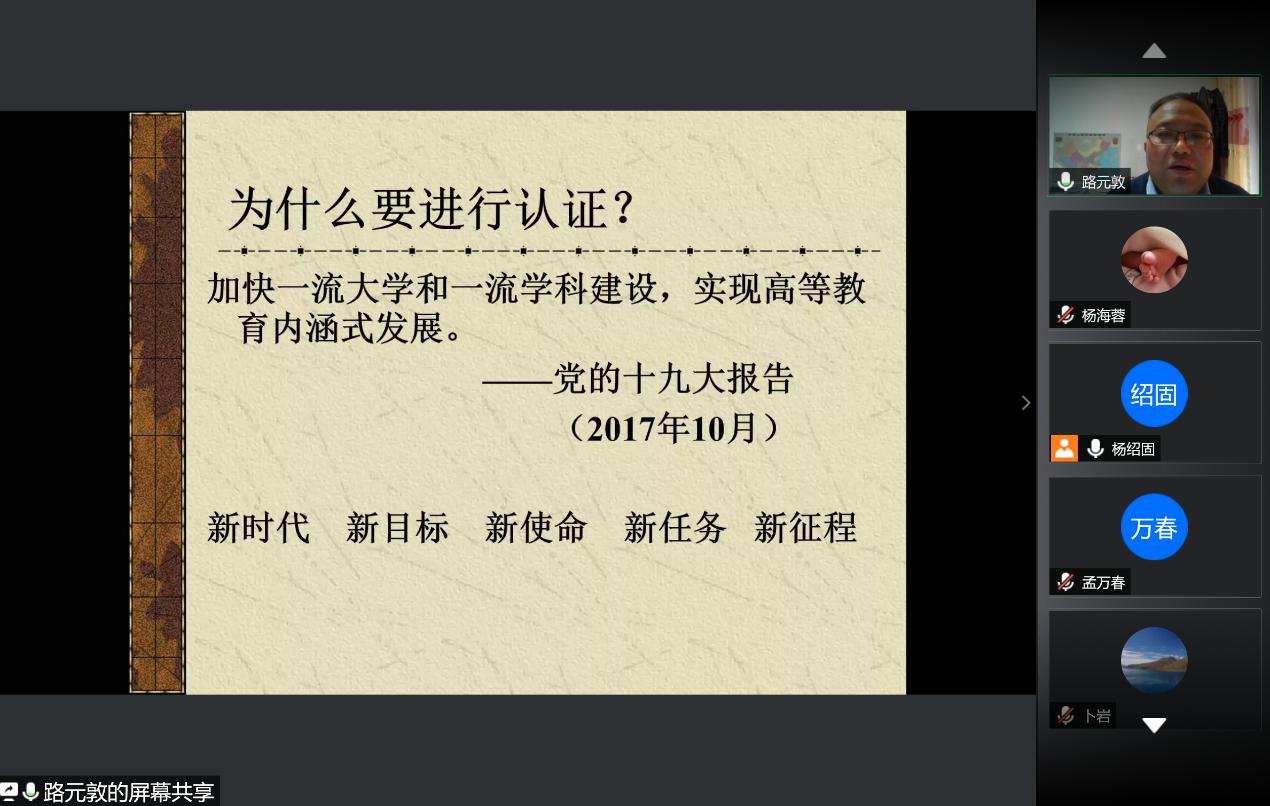 (本网讯)2月20日,我院邀请山东泰山学院文学院副教授、博士、副院长路元敦先生在腾讯会议为我院师生做关于师范专业认证的报告会。学院领导班子、中文专业全体教师、师范专业实习基地导师、外聘教师、研究生及毕业生代表等50余人聆听了报告会。报告会由教学副院长杨绍固主持。