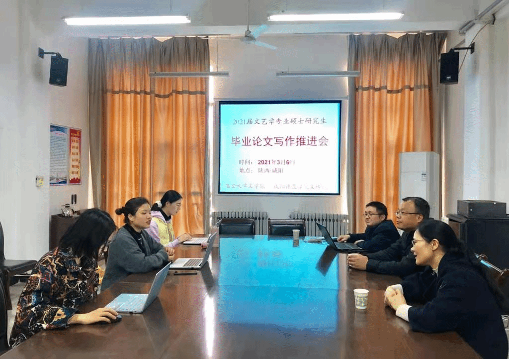 (本网讯)为全面落实研究生院发《关于做好2021年上半年研究生学位论文检测评审与答辩有关工作的通知》(延大研发【2021】1号)的文件精神,3月6日下午,我校文学院在咸阳师范学院文学院会议室,召开首届联合培养研究生学位论文预答辩专项工作推进会。我校文艺学专业硕士生导师王刚、傅美蓉、王效峰、刘鑫(在线)等出席会议。文学院院长王俊虎、咸阳师范学院文学院院长张鹏在线指导。