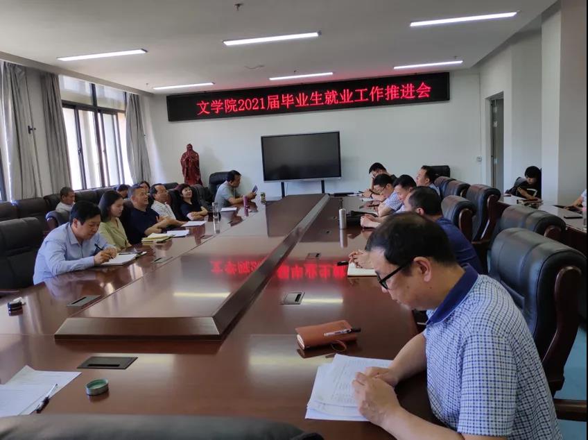 (本网讯)6月21日下午,文学与新闻传播学院在文学楼408会议室召开2021届毕业生就业工作推进会。文学院院长王俊虎、党委副书记李伟、中文系主任刘鑫以及全体硕士研究生导师参加了会议,会议由王俊虎主持。