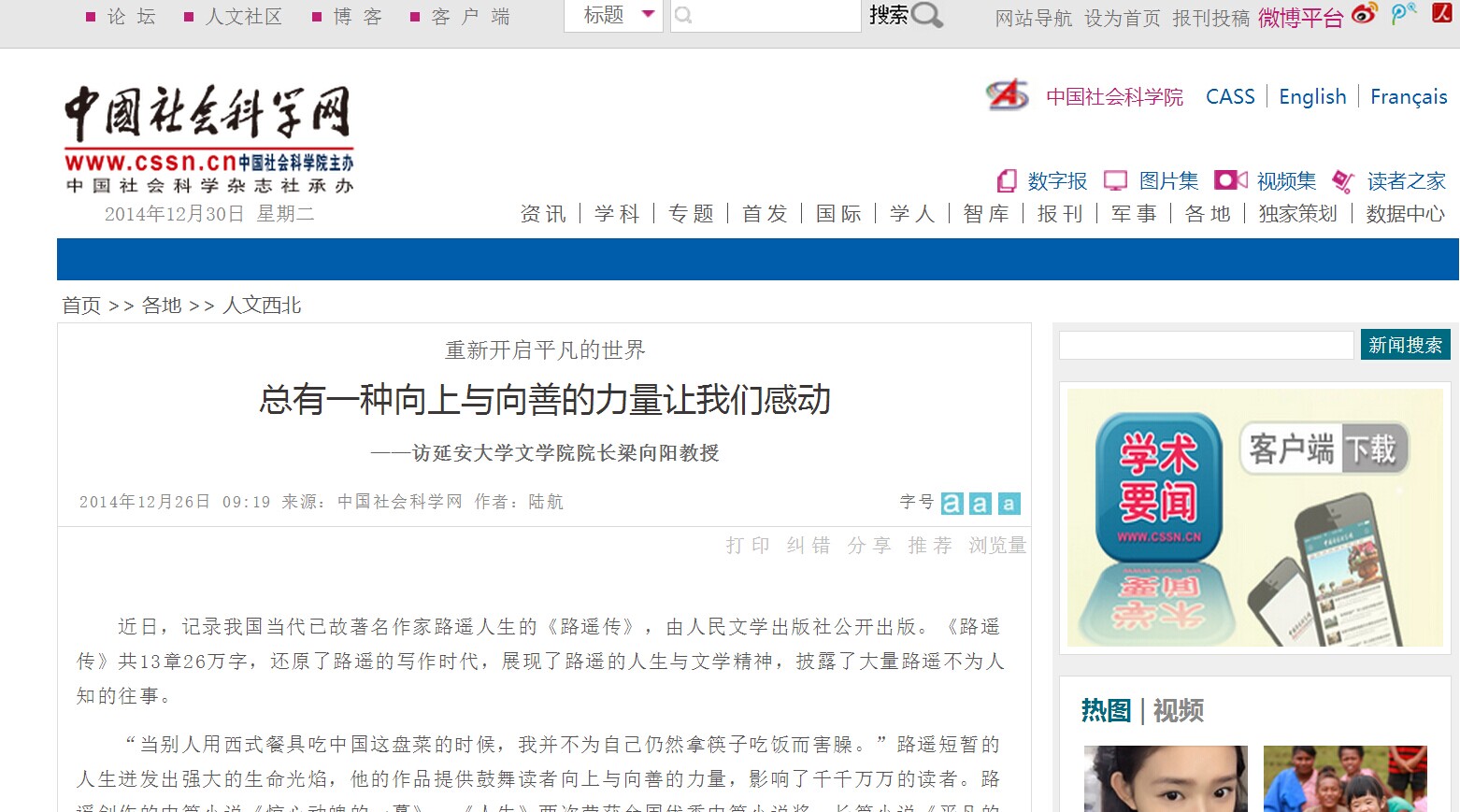 近日,我院梁向阳教授专著、记录我国当代已故著名作家路遥人生的《路遥传》,由人民文学出版社公开出版后,引起学术界的较大反响。中国社会科学网就此专门采访了报道了此事。